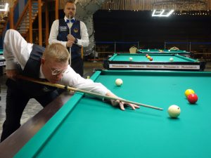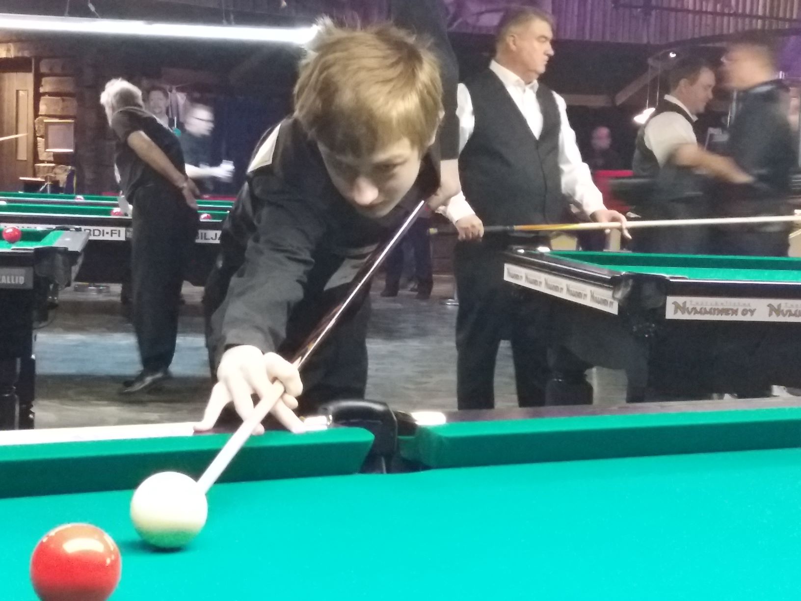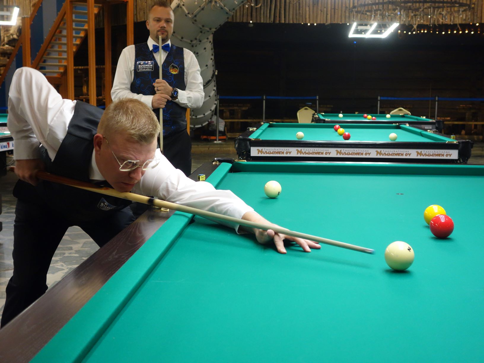 Konkari Ilkka Korhonen (vasemmalla) on aloittanut tämän kauden vahvasti. Oikealla Hyvinkään Joonas Vartia on moninkertainen nuorten Kaisan Suomenmestari. Aloitti kilpailut rökäletappiolla seurakaveriaan Toma Aurestoa vastaan 3-60, mutta on sen jälkeen piristänyt peliä.