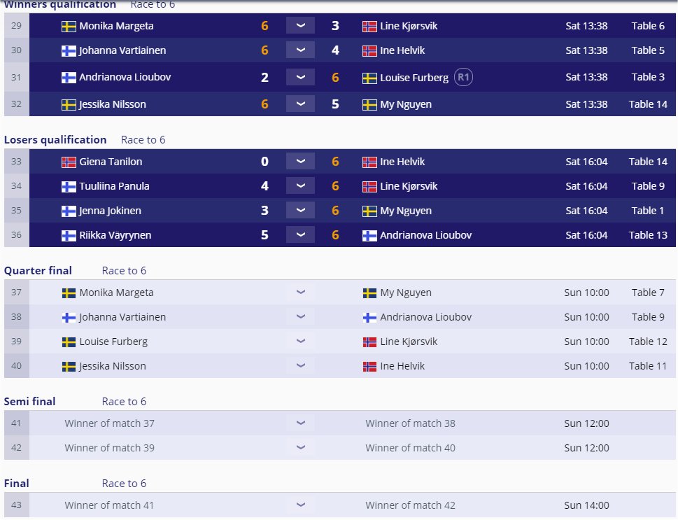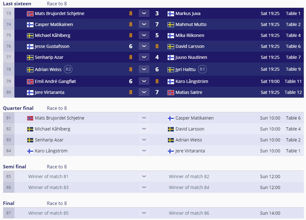 Oslossa 10-pallon PM-kilpailujen finaalipäivältä on odotettavissa sekä miesten että naisten sarjasta PM-mitalia kotimatkalle tuotavaksi. Kahdeksan parasta on molemmista sarjoista jäljellä ja miesten cupissa on kolme suomalaista vielä taistelemassa PM-kullasta. Isäntämaan Norjan ainoa jäljellä oleva edustaja Mats Brujordet Schjetne saa vastaansa aina supervahvan Suomen Casper Matikaisen. Neljä ruotsalaista pelaa vastakkain omissa puolivälieräkamppailuissaan mikä takaa Ruotsille jo varmat kaksi semifinaalipaikkaa. Viimeisessä parissa sen sijaan varmistuu Suomalaisittain PM-mitali, kun Karo Långström ja Jere Virtaranta mittaavat toistensa PM-kunnon. 8-cup ottelut alkavat klo 11:00 Suomen aikaa. 16-cupissa oli upeasti vielä peräti seitsemän Suomen edustajaa tavoittelemassa pelipaikkaa finaalipäivälle.